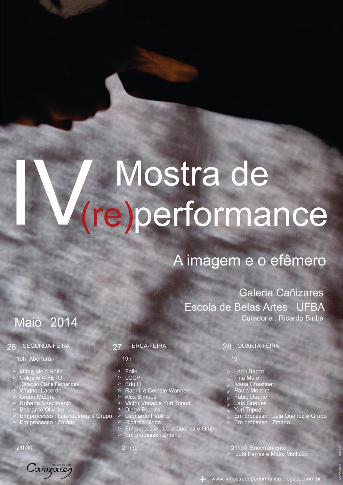 O evento acontece na Galeria Cañizares, das 19h às 21h30, de 26 a 28 de maio, e conta com a curadoria e direção feral de Ricardo Biriba, coordenação de Zmário e apoio educativo de Luís Carneiro Leão, Michelle Mattiuzzi, Ramon Sena, Rosa Bunchaft e Tales Demídio. Cada dia conta com cerca de oito performances de 15 minutos, totalizando 24 apresentações durante os três dias de evento.