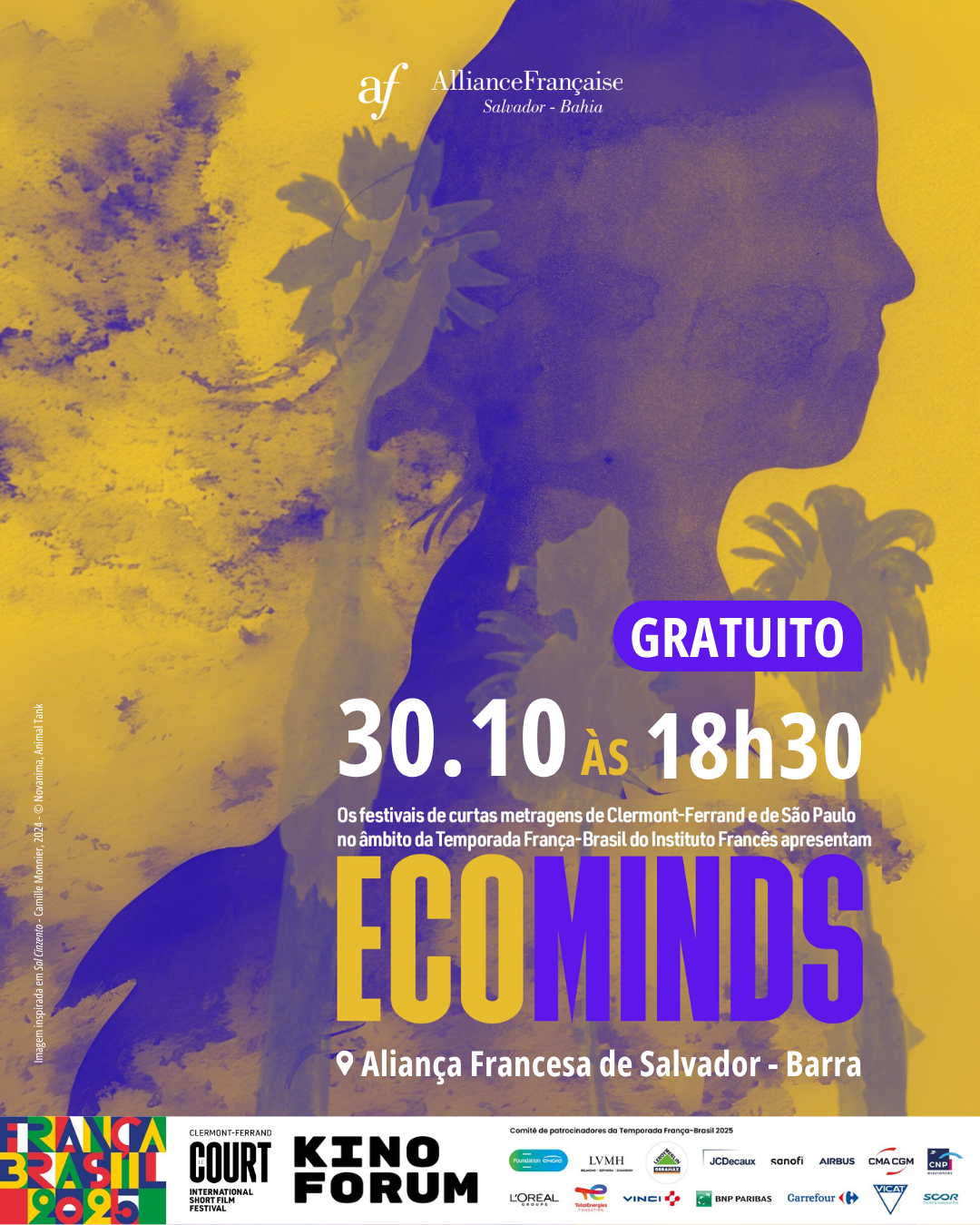 A Aliança Francesa de Salvador realiza no dia 30 de outubro uma sessão do projeto eco-minds, iniciativa do Festival Internacional do Curta-Metragem de Clermont-Ferrand e do Festival do Curta-Metragem de São Paulo. A sessão acontecerá na quinta, 30/10, às 18h30, na Galeria da Unidade Barra (Av. Sete de Setembro, 401 / 2726 – Ladeira da Barra).