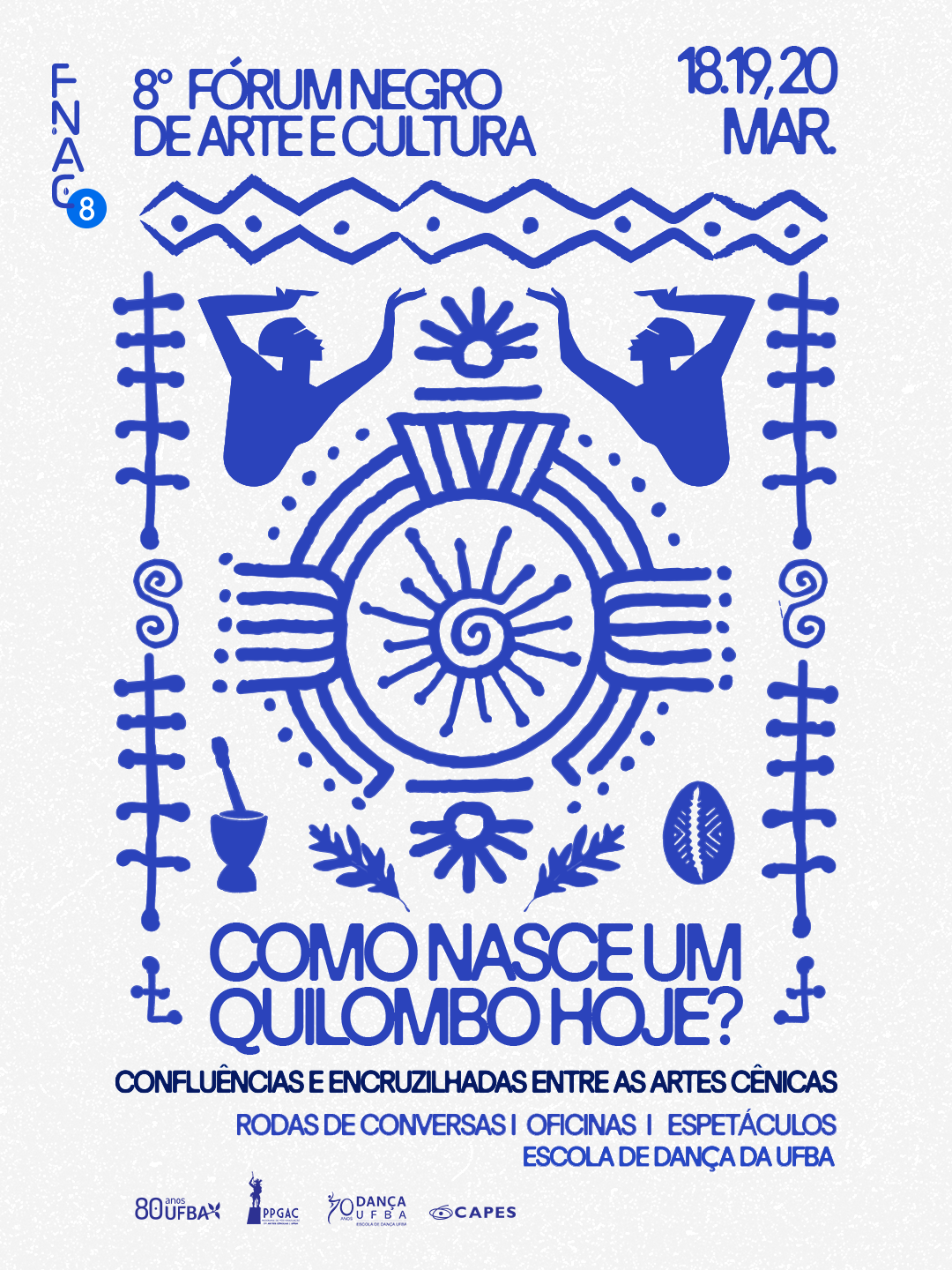 Salvador recebe, entre os dias 18 e 20 de março de 2026, o 8º Fórum Negro de Arte e Cultura (FNAC), que propõe discutir o quilombo como tecnologia viva de criação artística, organização social e produção de conhecimento.