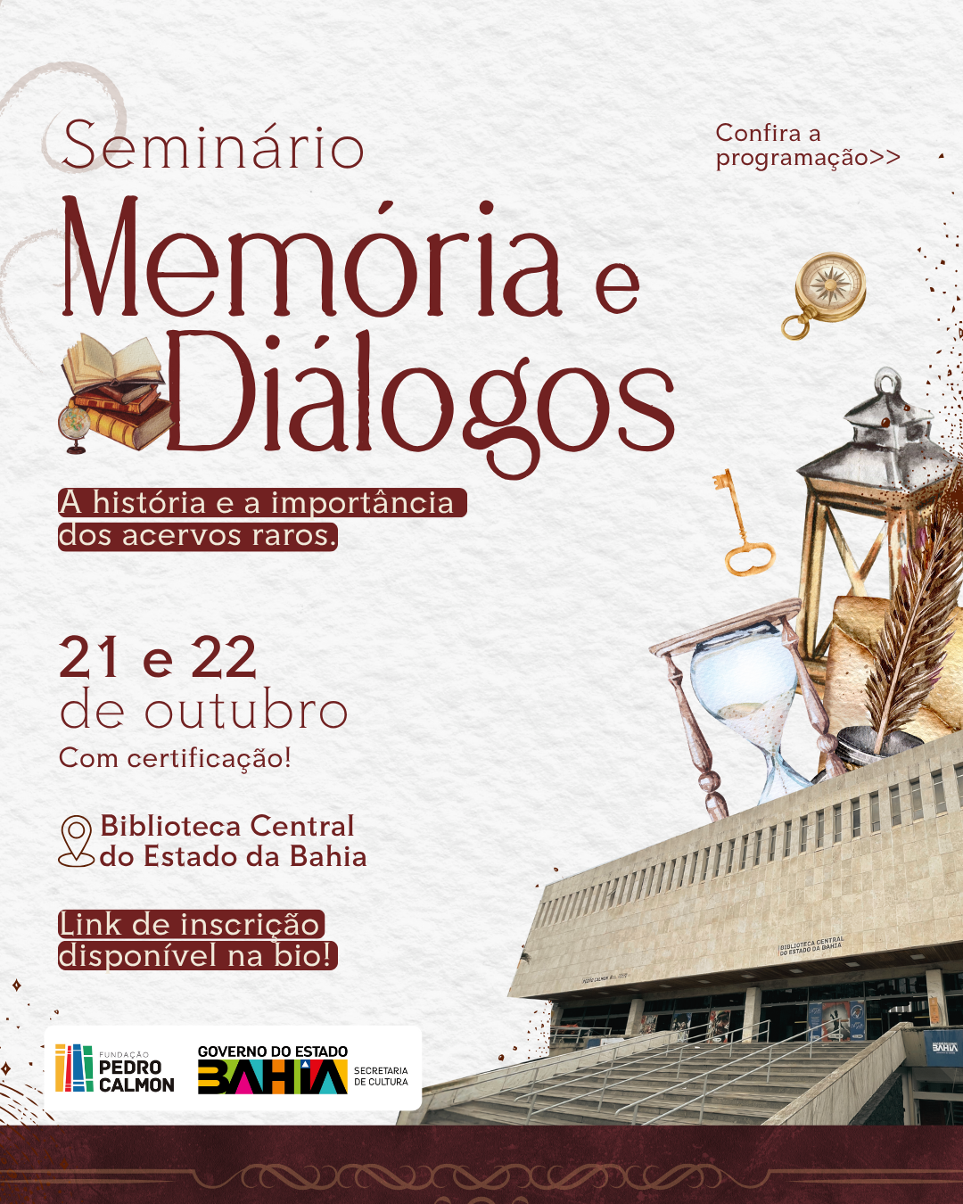 Para tratar sobre o assunto, a Fundação Pedro Calmon (FPC), unidade vinculada à Secretaria de Cultura da Bahia (Secult – BA), promove nos dias 21 e 22 de outubro, o Seminário Memórias e Diálogos: A História e a Importância dos Acervos Raros, com a participação de pesquisadores da área, mesas de debate, palestras e workshop de digitalização. O evento é voltado para estudantes, pesquisadores e aberto ao público com interesse no assunto.