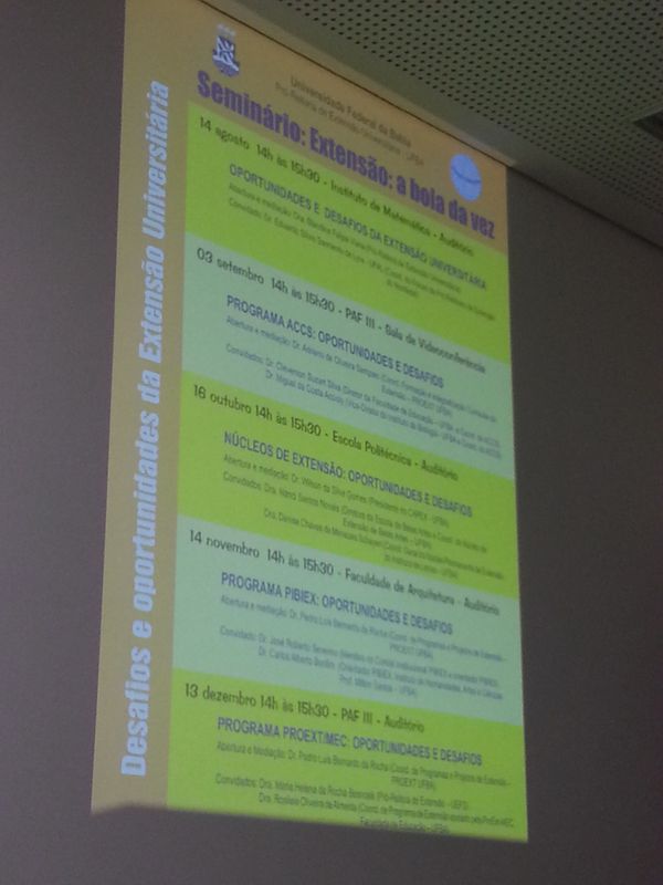 Serviço Para os próximos encontros, todos abertos e gratuitos, a PROEXT trará à UFBA os temas: em 3 de setembro, o papel dos Núcleos de Extensão nas Unidades Universitárias; em 16 de outubro, a curricularização da extensão com as ACCS; em 14 de novembro, as bolsas de extensão universitária (programa PIBIEX) e, fechando o ciclo dos seminários em 2013, as oportunidades de financiamento da extensão (programa PROEXT/MEC), em 13 de dezembro.