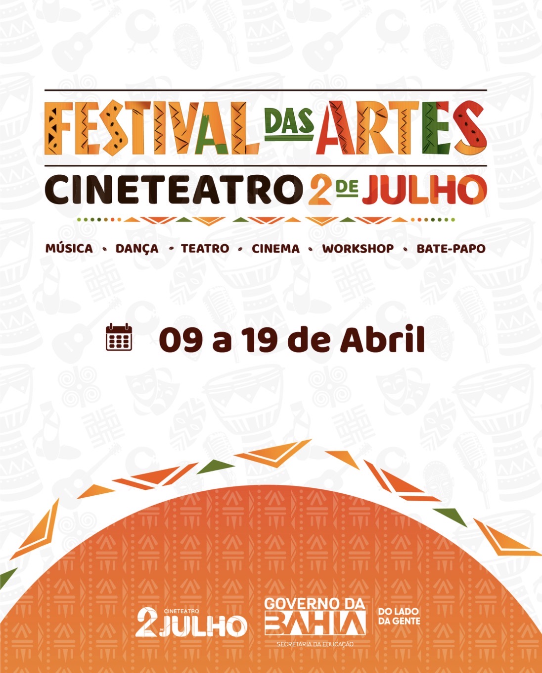 O Cineteatro 2 de Julho recebe, entre os dias 9 e 19 de abril, a primeira edição do Festival das Artes, evento dedicado à valorização da arte negra baiana. A programação reúne diferentes linguagens, como música, teatro, dança, cinema e ações formativas, com foco em diversidade, inclusão e acesso à cultura.