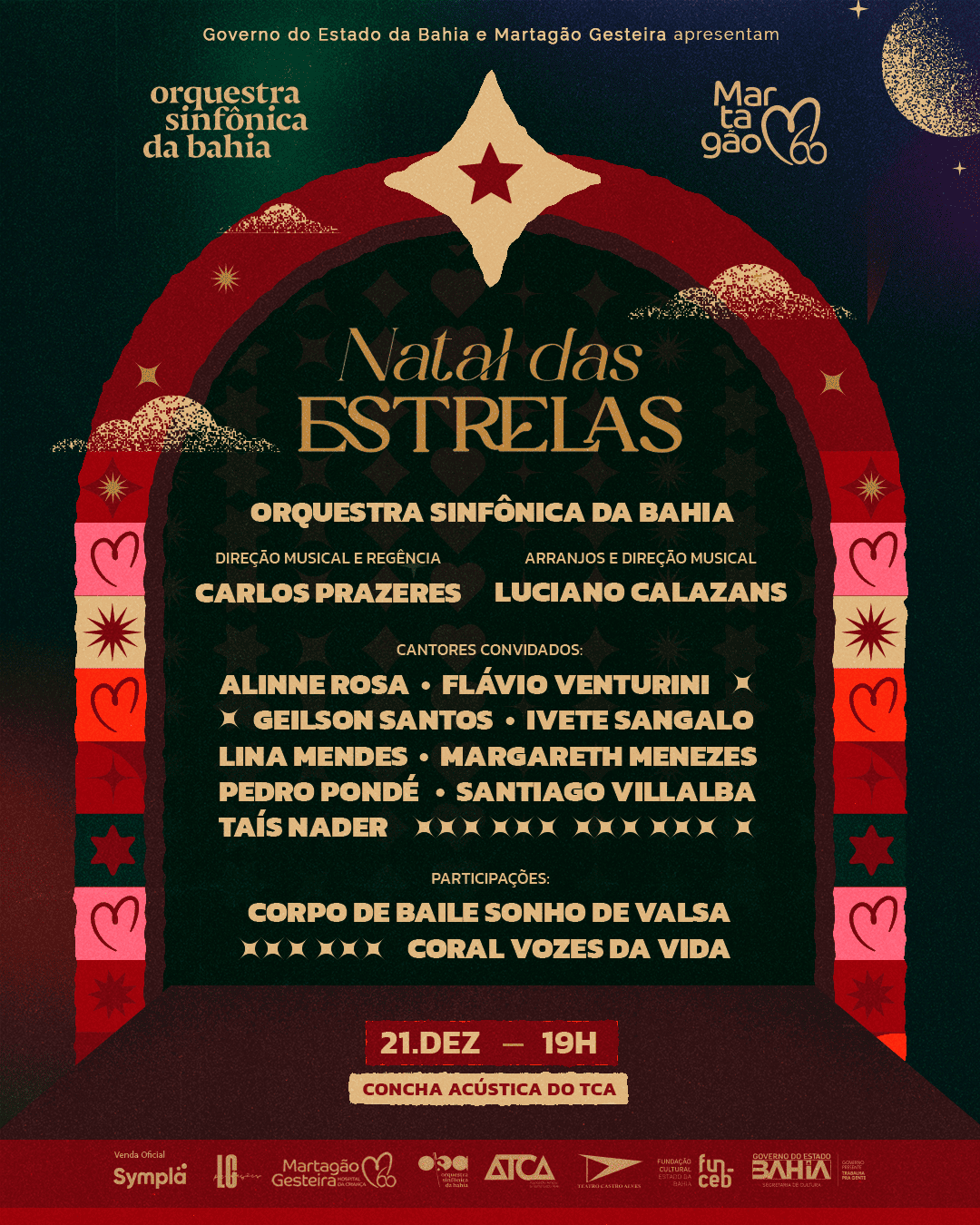 O “Natal das Estrelas” foi lançado oficialmente nesta quarta-feira (03) e reúne a Orquestra Sinfônica da Bahia (OSBA) e artistas baianos e nacionais em uma apresentação beneficente em prol do Hospital Martagão Gesteira, que completa 60 anos em 2025. O concerto será realizado no dia 21 de dezembro, às 19h, na Concha Acústica do Teatro Castro Alves.