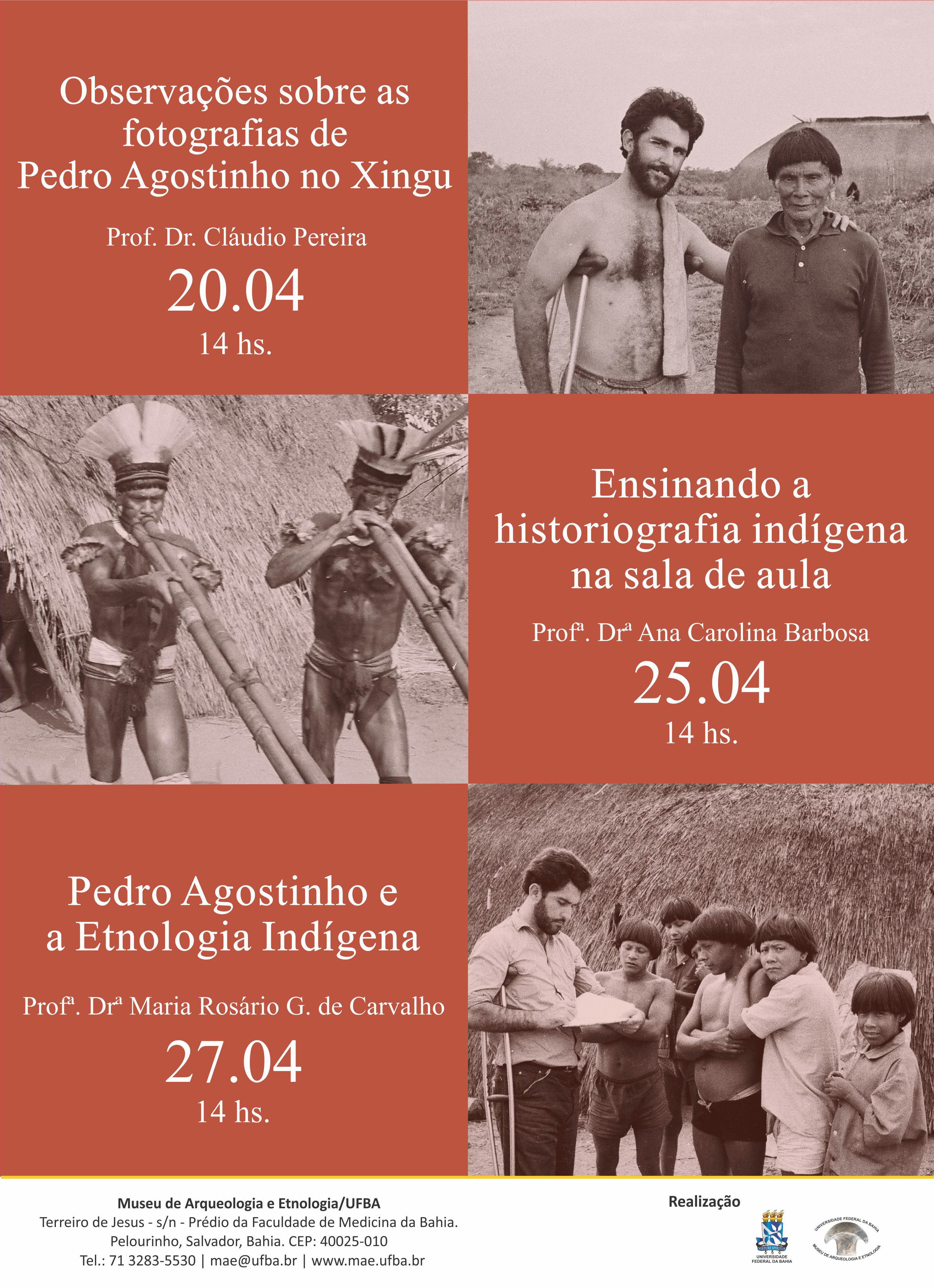 As palestras expõem os seguintes temas: “Observações Sobre a Fotografia de Pedro Agostinho no Xingu”, que será apresentada pelo Prof. Dr. Cláudio Luiz Pereira; “Ensaiando a Historiografia Indígena na Sala de Aula”, apresentada pela Profª Drª Ana Carolina Barbosa e; “Pedro Agostinho e a Etnologia Indígena”, ministrada pela Profª Drª Maria Rosário G. de Carvalho. As inscrições para o evento serão realizadas nos 2 primeiros dias antes das palestras, os interessados podem solicitar o atestado de participação.