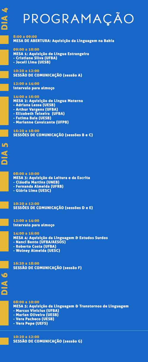 O evento procura reunir professores, alunos e profissionais que atuam na área da Aquisição da Linguagem na Bahia, com o objetivo de obter um panorama das pesquisas em desenvolvimento e dos estudos sobre aquisição da linguagem no estado. Haverá a apresentação de trabalhos de participantes de universidades de outros estados a exemplo da UFRGS, UERGS, UNIFESP, IFPB, UFPB e UNICAP.