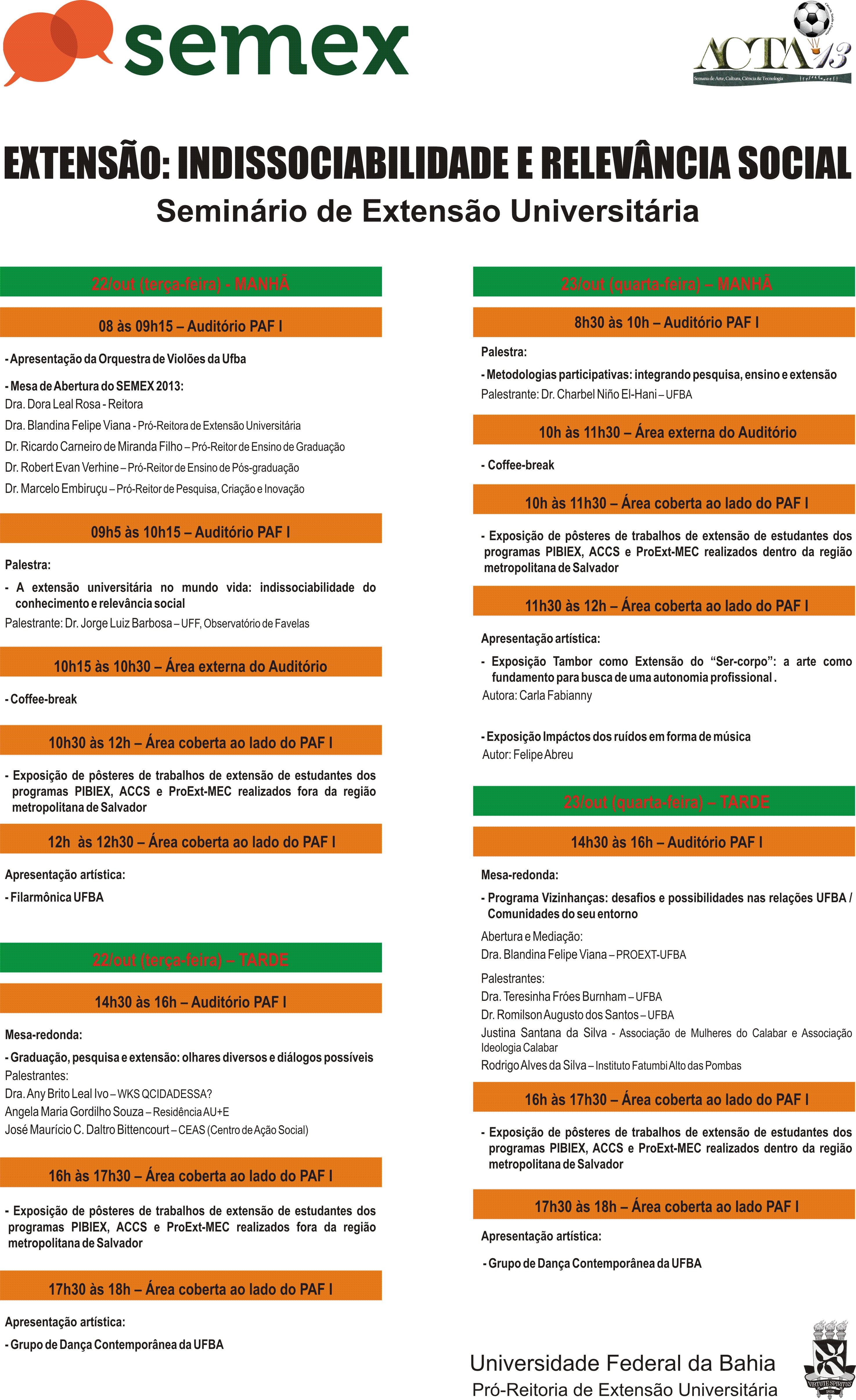 Acontece entre terça (22) e quarta-feira (23) o Seminário de Extensão Universitária (SEMEX 2013), promovido pela Pró-Reitoria de Extensão Universitária da UFBA (Proext). O evento, de entrada gratuita, é destinado a estudantes, pesquisadores, professores, servidores da UFBA e à comunidade em geral.