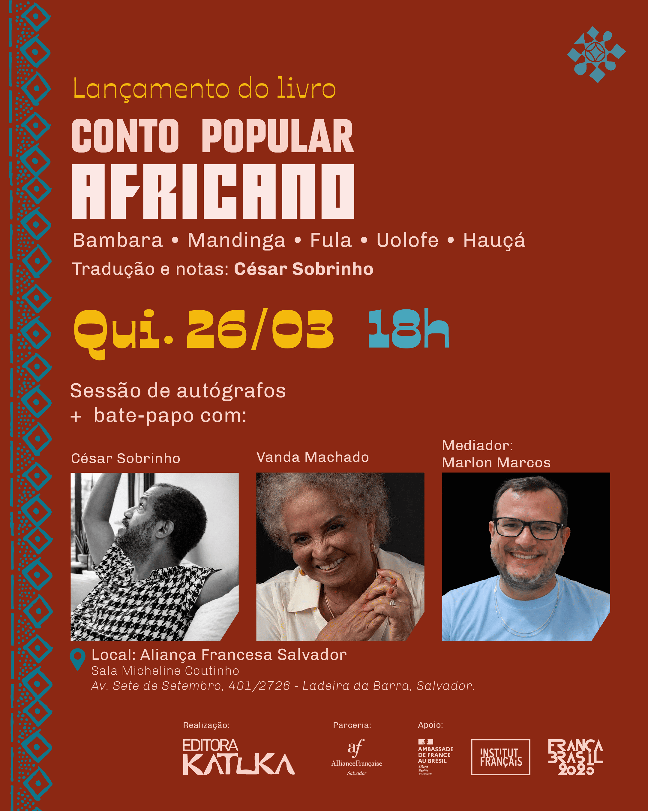A Editora Katuka, casa editorial preta e independente sediada no Centro Histórico de Salvador, anuncia o lançamento do livro “Conto Popular Africano: Contos Bambara, Mandinga, Fula, Uolofe e Hauçá”. Com tradução de César Sobrinho, a obra promove uma ponte literária entre o continente africano e o Brasil, trazendo narrativas que preservam filosofias de vida e ensinamentos desses cinco povos.