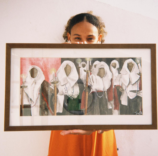 Filha do Recôncavo Baiano, Ludmilla Lima nasceu em Cruz das Almas e atualmente vive em Salvador. Transitando por linguagens como aquarela, acrílico, graffiti, ilustração digital, fotografia e tatuagem, sua obra mergulha na ancestralidade e nas vivências cotidianas da Bahia. Com formação em Engenharia de Pesca e mestrado em Artes Visuais em andamento pela UFBA, Ludmilla participou de exposições nacionais e internacionais, incluindo sua estreia individual em 2023 e a coletiva Okê Arô Okê, na Galería Paul Bardwell, na Colômbia. Sua arte é um gesto de resistência e reencantamento do cotidiano.