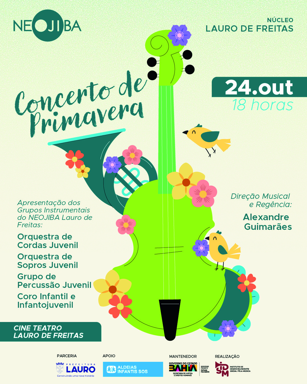 Nesta quinta-feira (24), às 18h, o Cine Teatro Lauro de Freitas recebe o Concerto de Primavera, com apresentações dos grupos instrumentais do Núcleo NEOJIBA Lauro de Freitas. O espetáculo celebra a estação das flores com um repertório especial executado por jovens talentos da região.