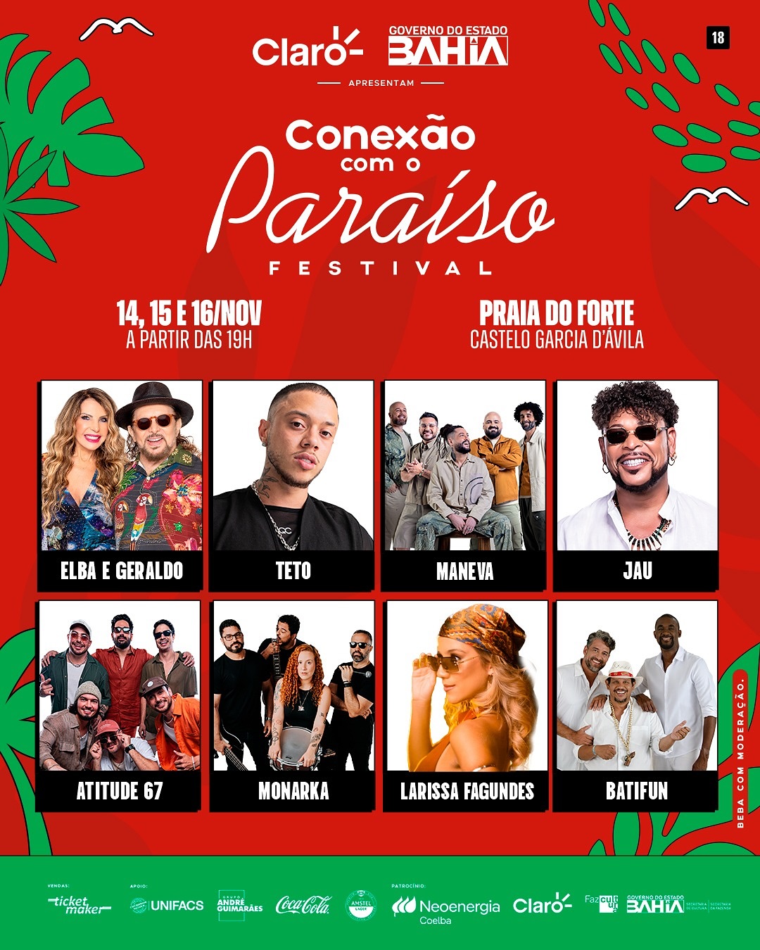 O feriado da Proclamação da República vai conectar música e natureza neste final de semana na Praia do Forte. É lá que acontece, entre sexta (14) e domingo (15) a quarta edição do Conexão com o Paraíso, com programação no Castelo Garcia D’Ávila e na vila do destino do Litoral Norte baiano. Os ingressos estão à venda no site da Ticket Maker.