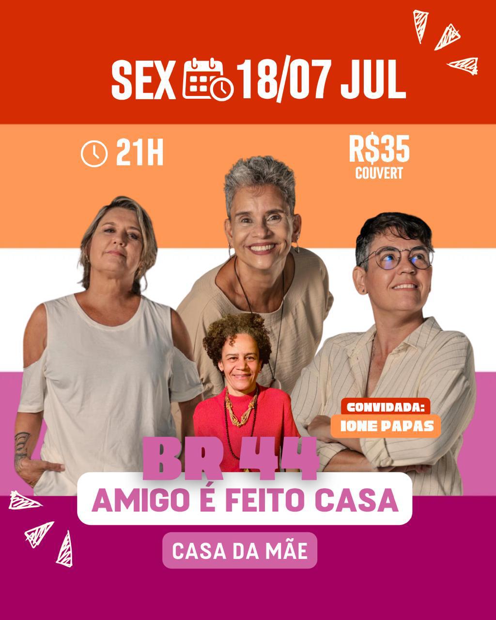 No mês em que é comemorado o Dia do Amigo, a banda BR 44 lança o projeto: “Amigo é feito casa”, na Casa da Mãe (Rio Vermelho), cenário perfeito para celebrar as amizades que a música proporciona. O primeiro encontro da série de shows será nesta sexta (18/07), às 21h. Os ingressos serão vendidos no local e dia do evento, por R$35.