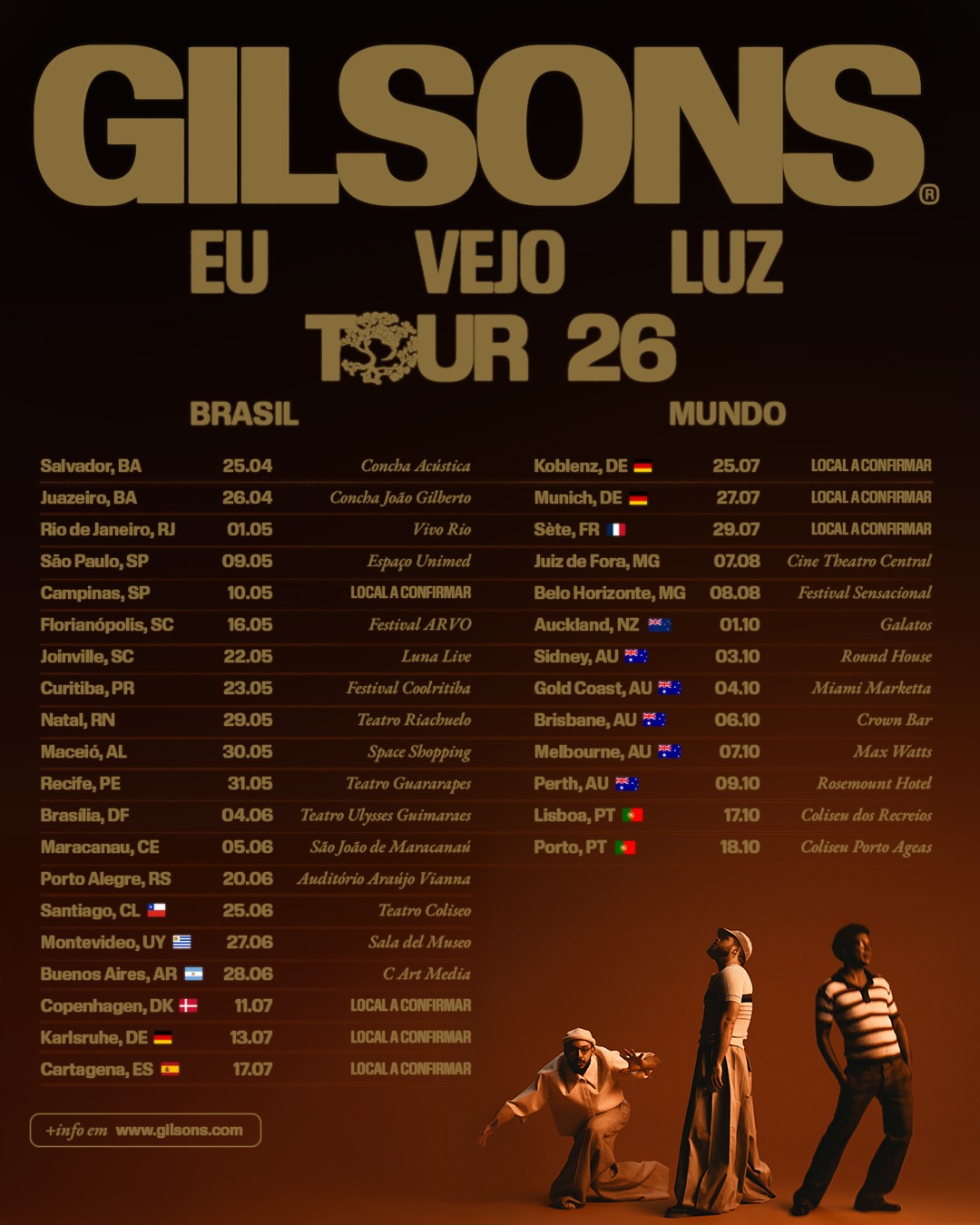 O trio Gilsons lança a turnê mundial Eu Vejo Luz, que acompanha o novo álbum do grupo e reúne mais de 30 shows confirmados no Brasil e no exterior. Em Salvador, a apresentação acontece no dia 25 de abril, na Concha Acústica.