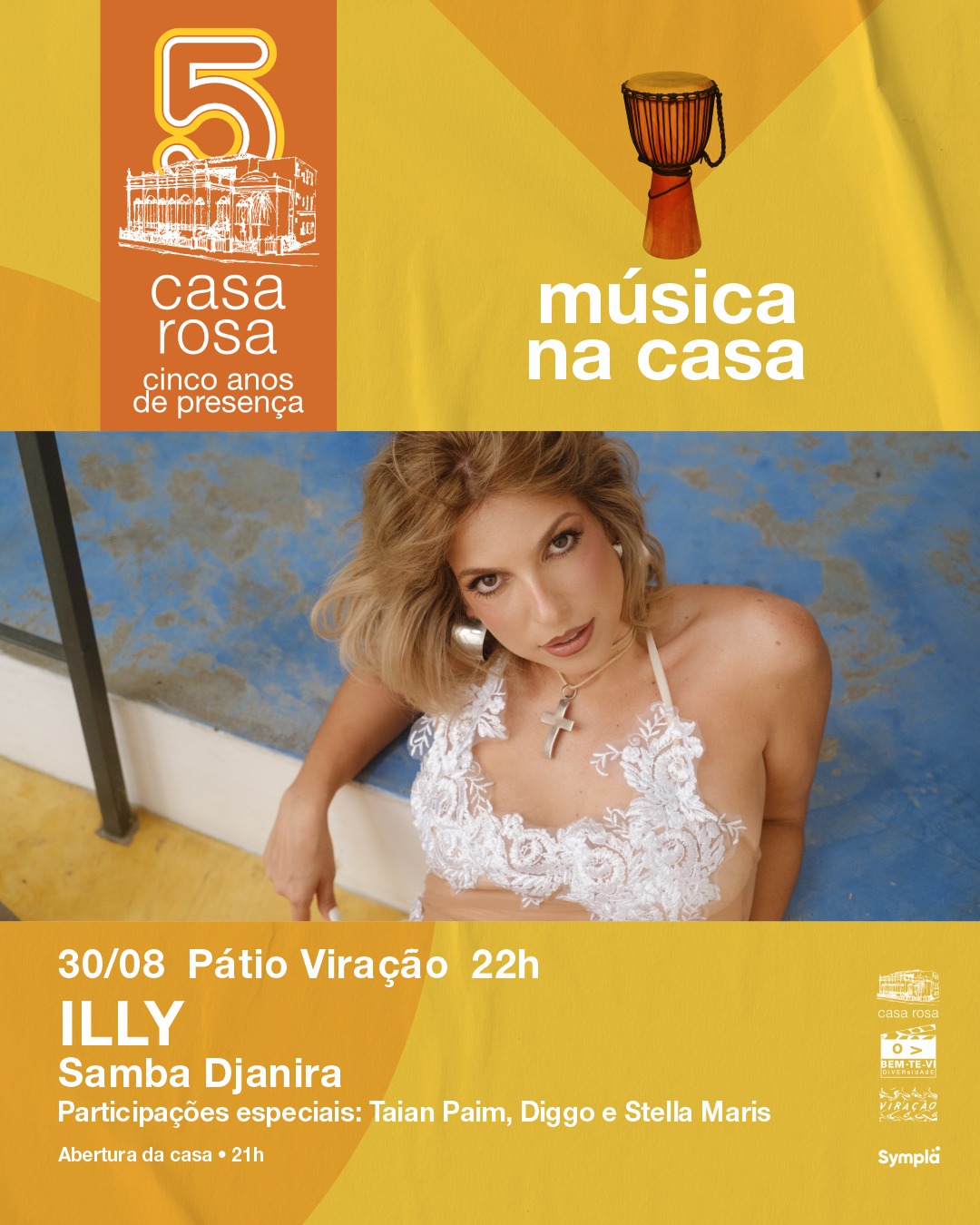 Na programação especial do aniversário de 5 anos da Casa Rosa, Illy realiza o “Samba Djanira”, a roda de samba mais libertária do Brasil, no dia 30 de agosto, às 22h. Nesta celebração vibrante, com repertório que homenageia a história e os grandes nomes do samba da Bahia e do Brasil, a cantora receberá convidados especiais – Taian Paim, Diggo e Stella Maris –, para uma festa que valoriza a música e a cultura popular brasileira. No repertório, estão canções autorais e de artistas como Batatinha, Riachão, Roberto Mendes, Arlindo Cruz, Conexão Negra, Gerasamba, Nossa Juventude, Xande de Pilares, além de clássicos imortalizados nas vozes de Clara Nunes, Péricles e Belo. Ingressos estão à venda pela Sympla.