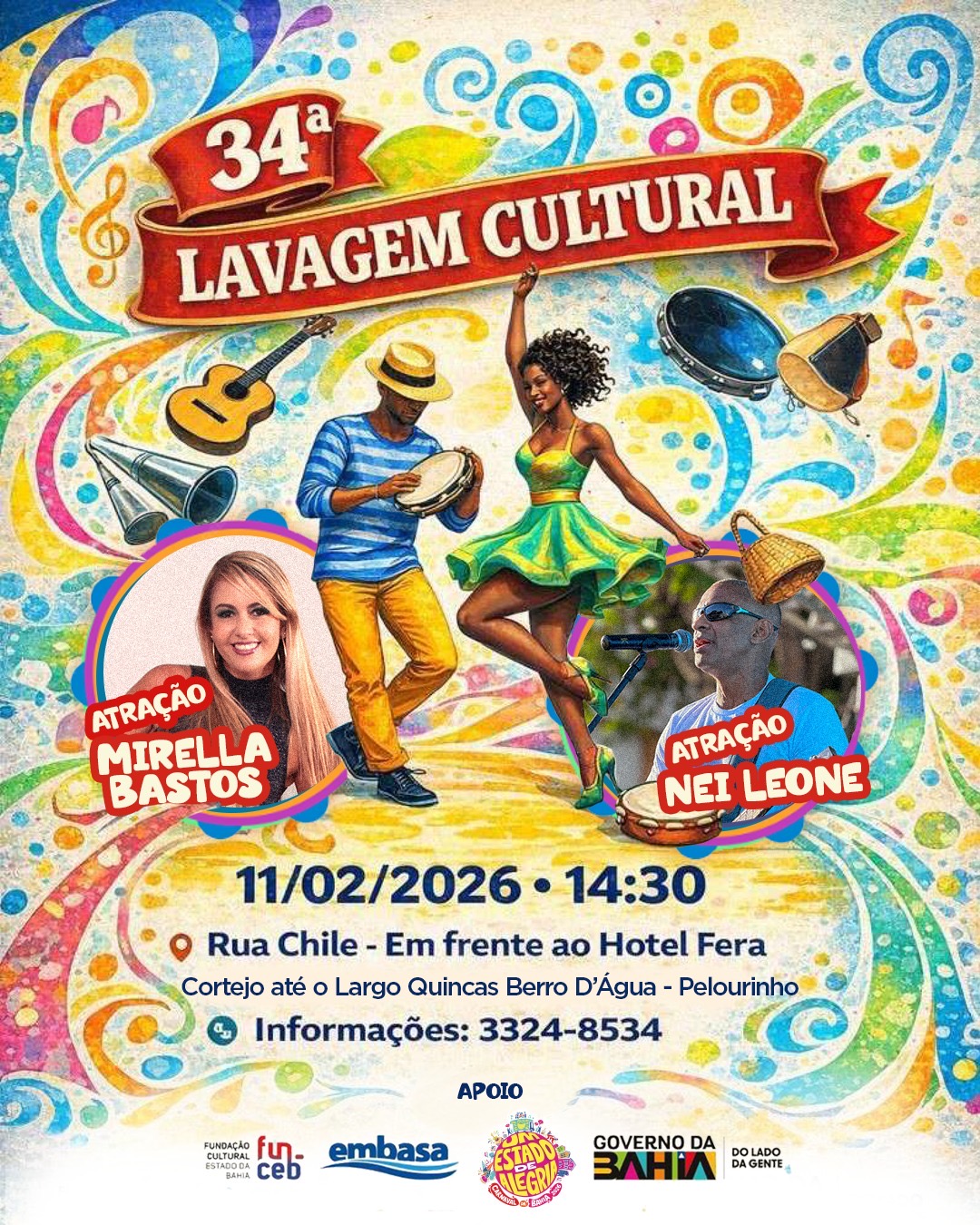 A tradicional Lavagem Cultural chega à sua 34ª edição celebrando o samba como expressão de ancestralidade, resistência e alegria do povo baiano. Abrindo o calendário carnavalesco do Centro Histórico de Salvador, o cortejo acontece na quarta-feira, 11 de fevereiro, um dia antes da abertura oficial do Carnaval.