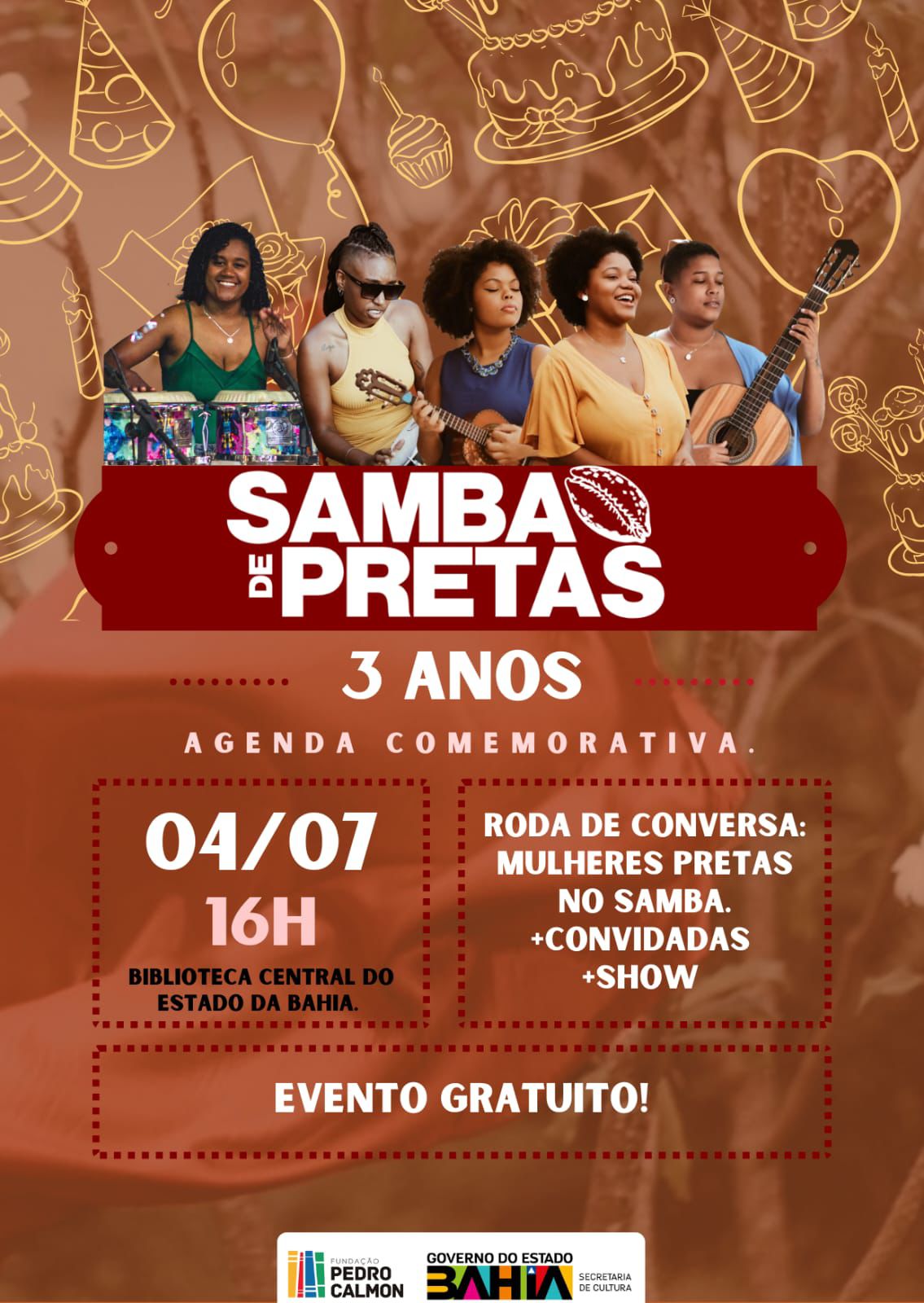 A Biblioteca Central do Estado da Bahia (BCEB), equipamento da Fundação Pedro Calmon (FPC/SecultBA), em parceria com o grupo Samba de Pretas, realizará o evento “3 anos de Samba: Mulheres Negras, Raiz e Ritmo”, em celebração ao aniversário da banda e como abertura da programação do Julho das Pretas.
