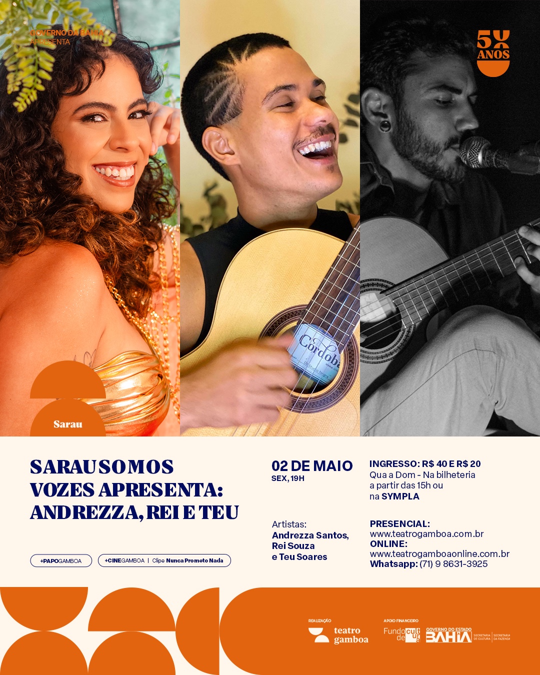 O projeto Sarau Somos Vozes estreia no Teatro Gamboa, em Salvador, no dia 02 de maio, às 20h, com uma apresentação inédita de Andrezza Santos, Rei Souza e Teu Soares, três artistas do interior da Bahia que celebram a diversidade da música autoral baiana. O show inclui a estreia ao vivo de uma música composta coletivamente pelos três.
