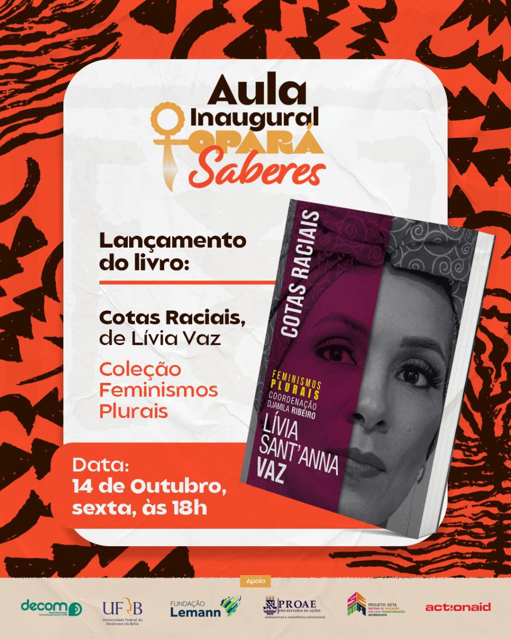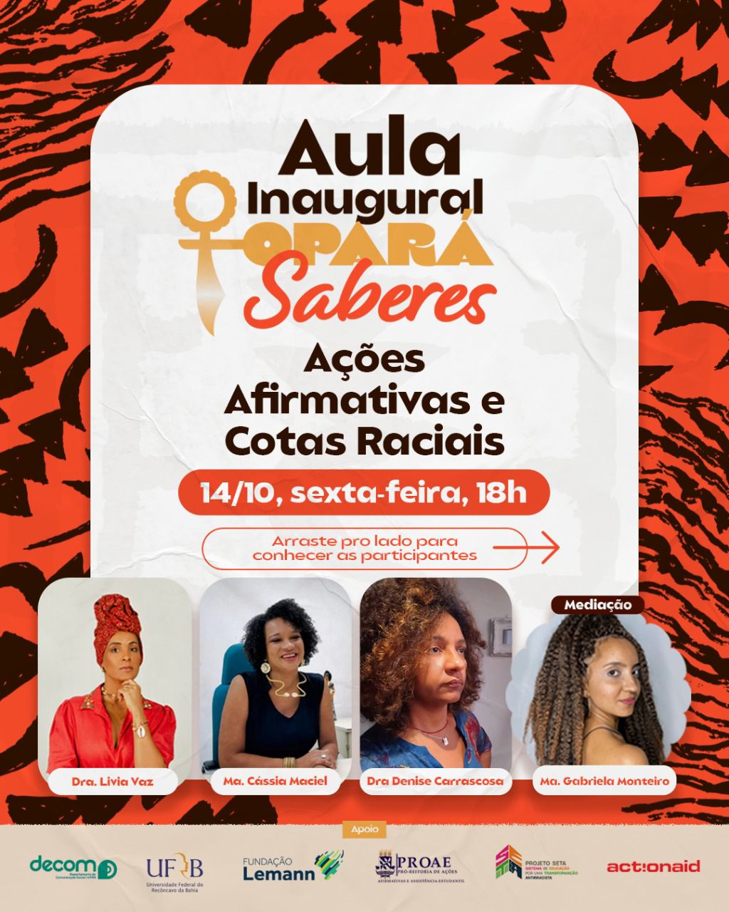O debate terá a participação da Dra. Cássia Maciel, Pró Reitora de Ações Afirmativas da UFBA; Dra Denise Carrascosa, professora de Literatura da UFBA e líder do Projeto de Remição de Pena por Leitura Corpos Indóceis e Mentes Livres no sistema prisional baiano, há 12 anos; Dra Cândida Moraes, professora da UFRB e autora do livro Mulher Raio; e da Dra. Lívia Sant’Anna Vaz – que na ocasião também fará o lançamento do seu livro “Cotas Raciais”, da coleção Feminismos Plurais, coordenada pela intelectual Djamila Ribeiro, uma das professoras convidadas e apoiadoras da iniciativa que defende o enegrecimento da pós-graduação pública no Brasil. A mediação do evento será realizada por Gabriela Monteiro, Coordenadora Executiva da Opará Saberes.