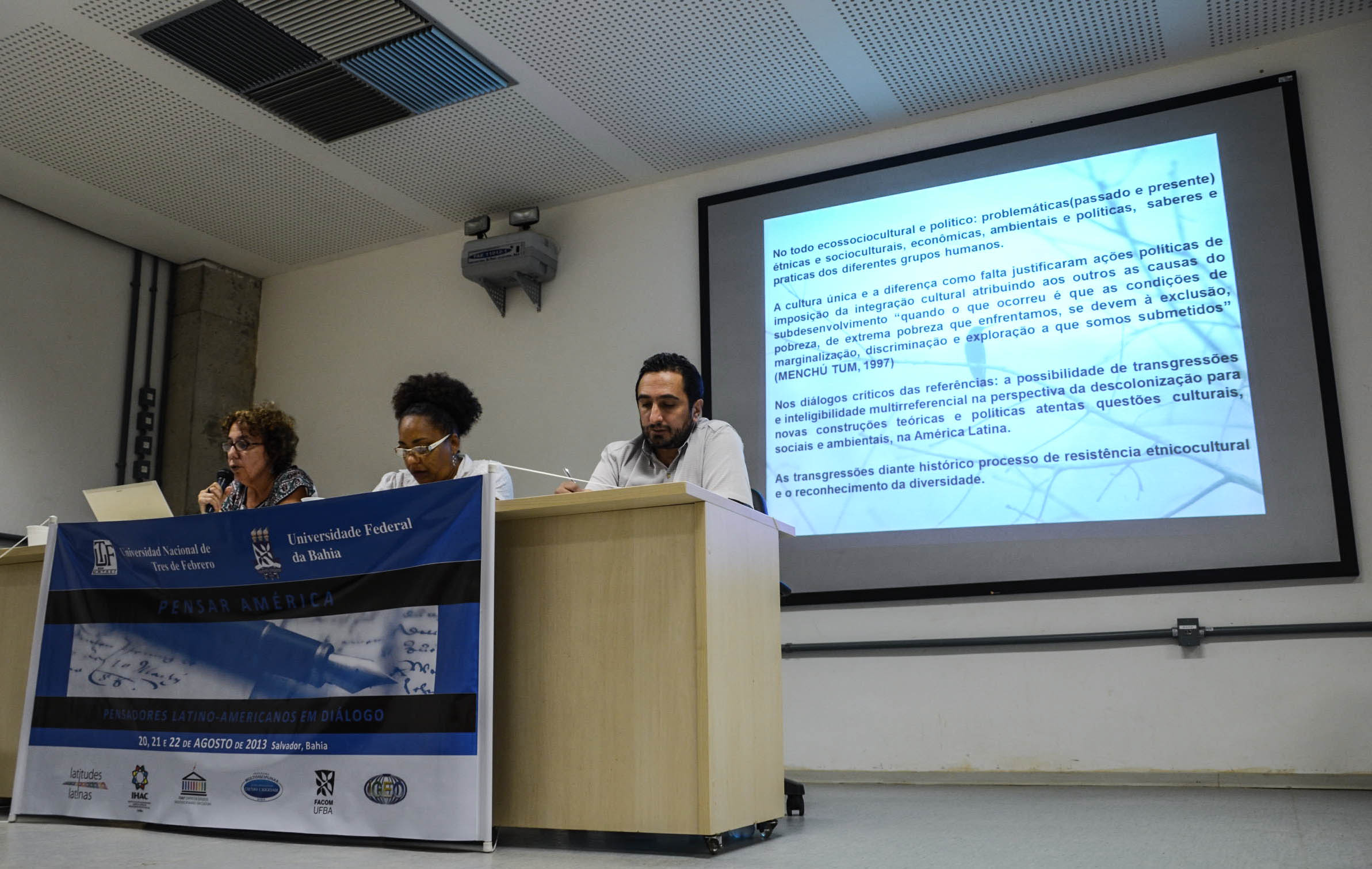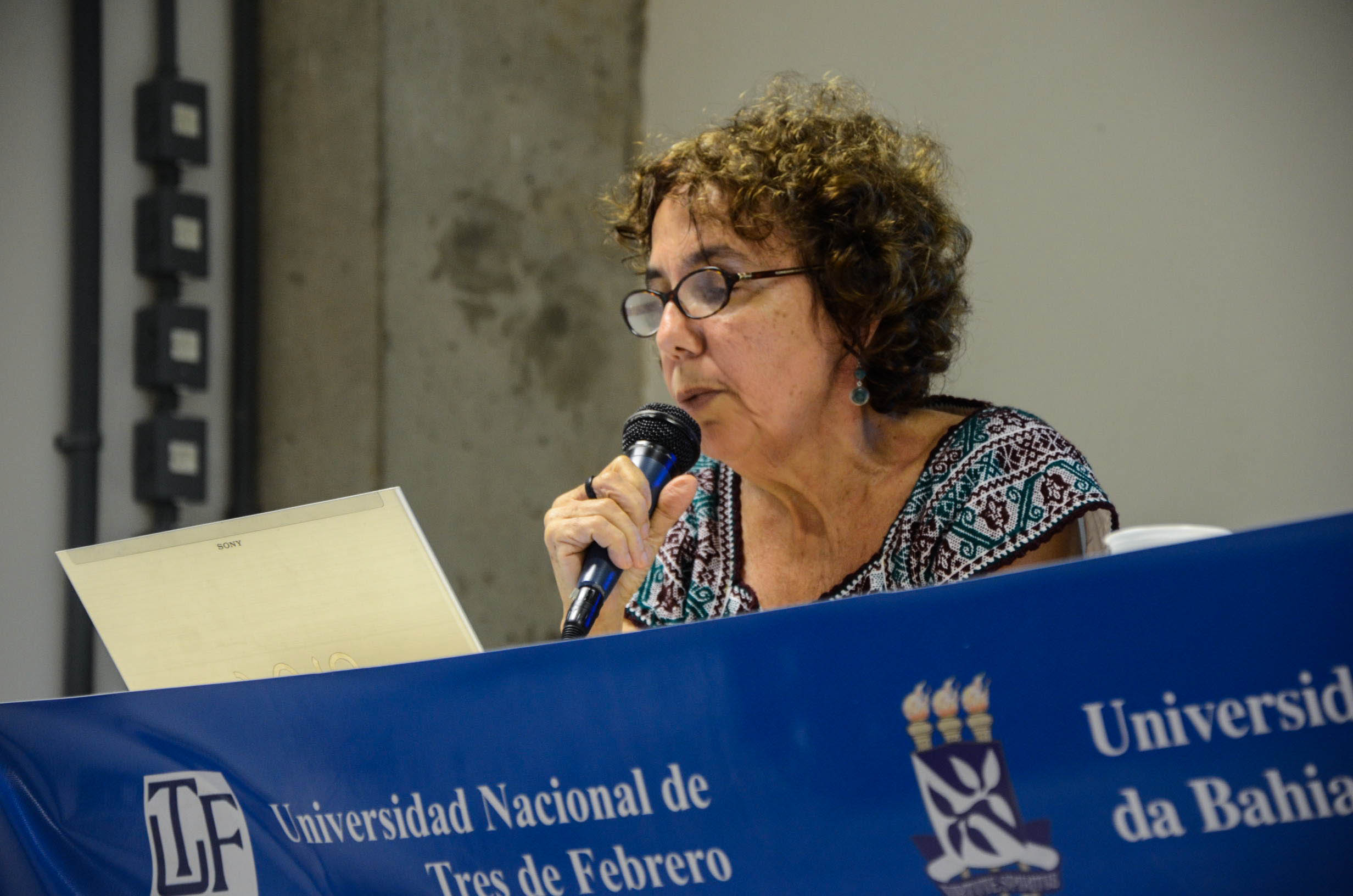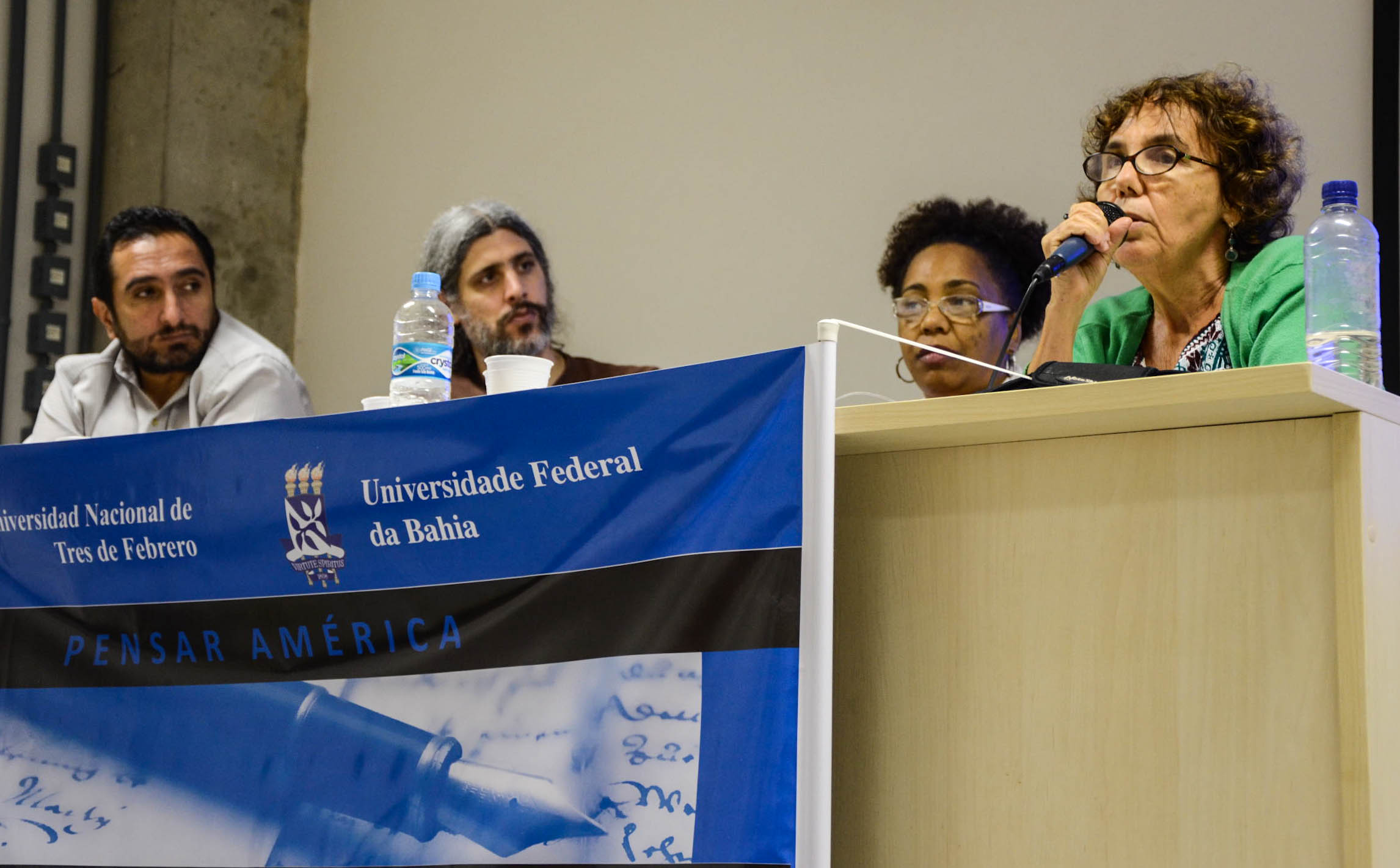 A discussão foi mediada por Nádia Cardoso, doutoranda do Programa Multidisciplinar de Pós-Graduação em Cultura e Sociedade (Pós-Cultura) da UFBA, e aconteceu no auditório do PAF V. A mesa contou com a presença de Clélia Côrtes, professora coordenadora do PET Indígena (UFBA), José Tasat e Juan Pablo Pérez, ambos professores da Universidad Nacional de Tres de Febrero (UNTREF), em Buenos Aires.