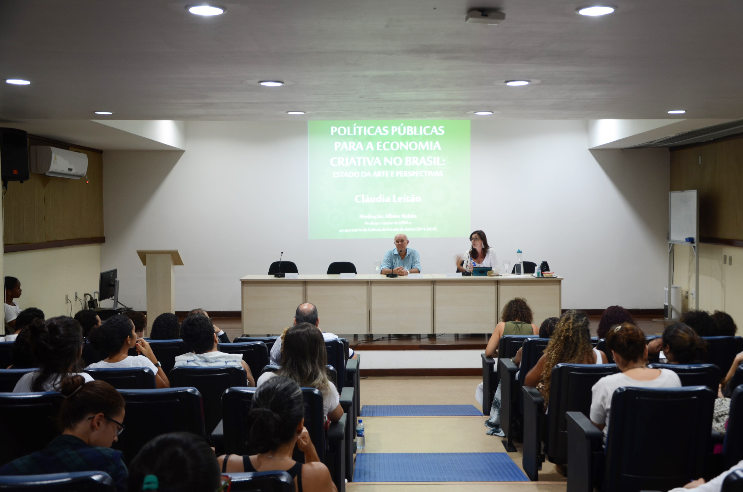 Construir uma economia da cultura capaz de incluir os pequenos produtores culturais e artistas. Esta foi a principal questão levantada pela ex-secretária de Economia Criativa do Ministério da Cultura, Cláudia Leitão, durante sua palestra sobre “Políticas Públicas para a Economia Criativa no Brasil”. A atividade foi mediada pelo ex-secretário de Cultura do Estado da Bahia, Albino Rubim e reuniu cerca de 80 pessoas no auditório da Faculdade de comunicação da UFBA.