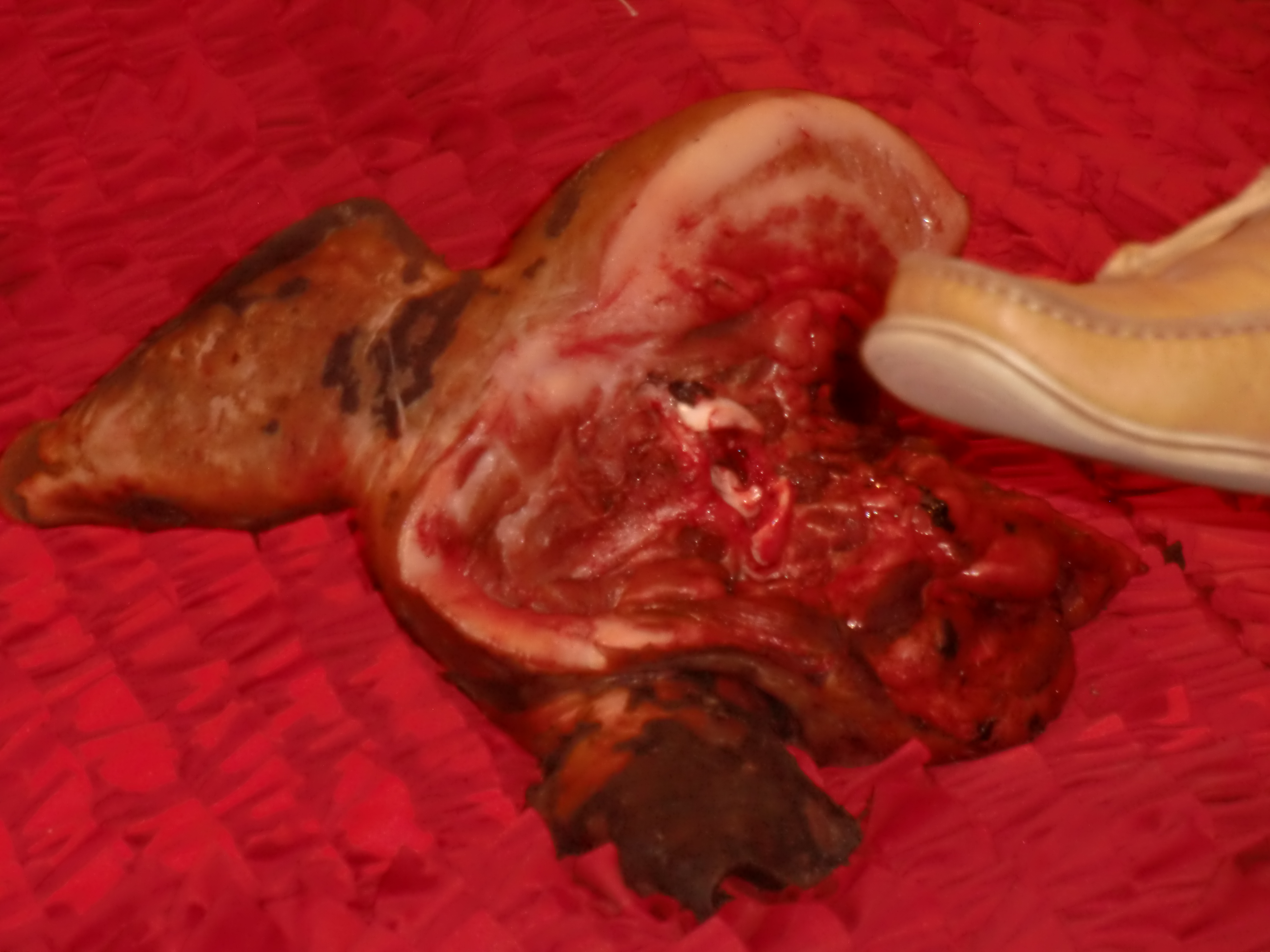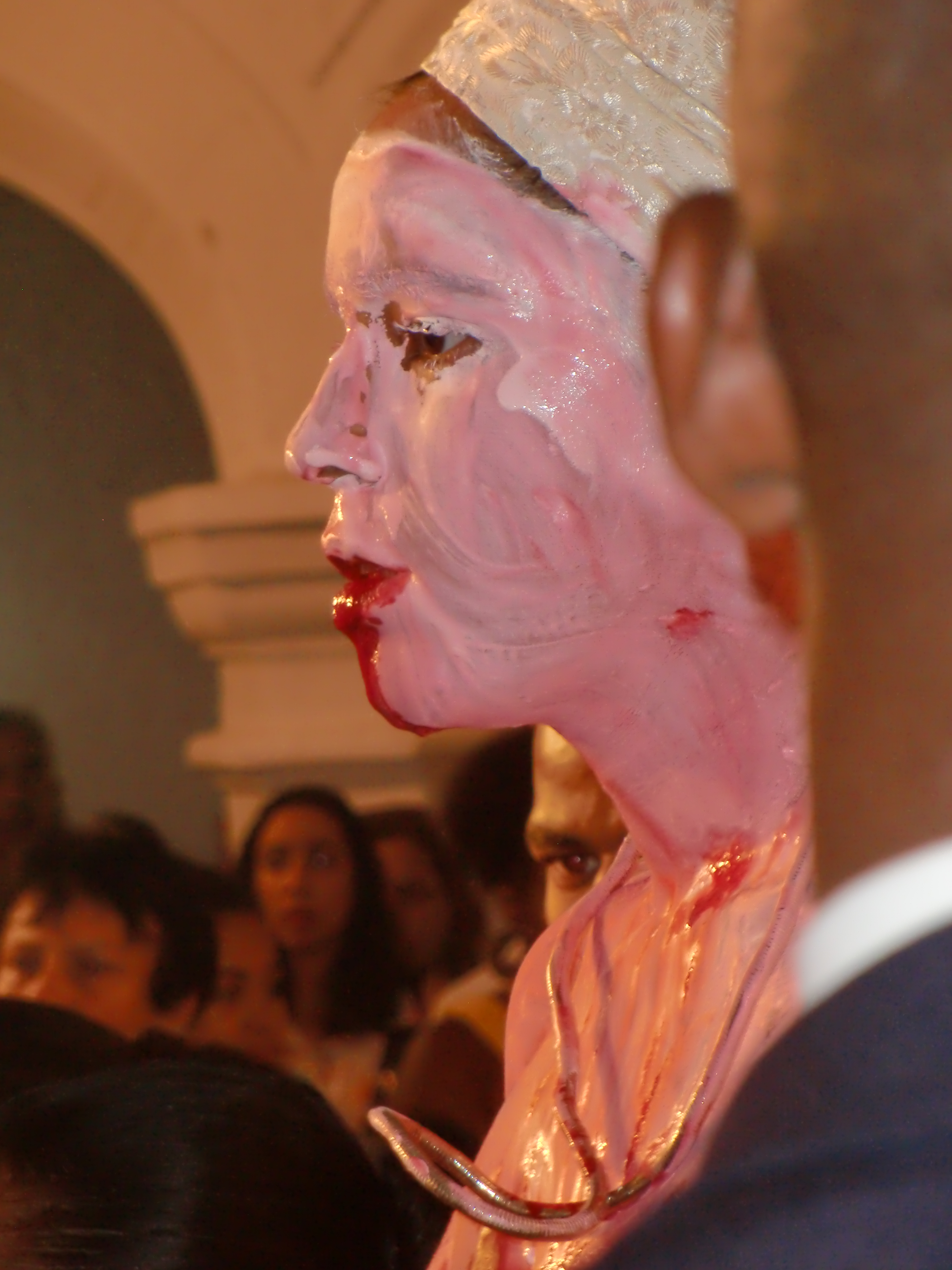 Pele, carne e sangue Iniciada com insultos a Magnoli, a manifestação contou com pessoas que pintaram seus corpos, simbolizando o sangue perdido pela população de origem africana ao longo do regime escravocrata e seus desdobramentos. Cartazes e militantes gritando palavras de ordem estiveram ao lado de parte do público que, aderindo à causa, ergueu pedaços de papel com os dizeres “sou/fui cotista”, em resposta ao posicionamento de Demétrio Magnoli contrário à política de cotas raciais. Uma cabeça de porco decepada, posicionada e exposta em meio ao palco também compôs o cenário da oitava mesa do festival literário.
