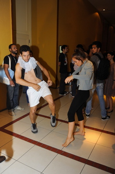 Durante a intervenção, os bailarinos interagiram com o próprio espaço, objetos e pessoas. A apresentação teve como marca a improvisação. “A intervenção foi feita especificamente para o evento, com essas características de improvisação, personagens, encontros”, explica Gilsamara.