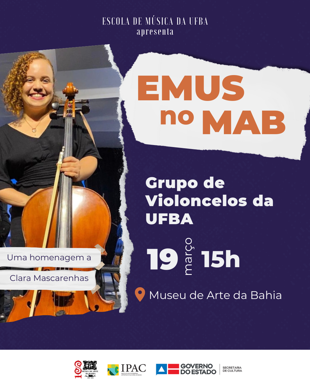 No Museu de Arte da Bahia (MAB), no dia 19 (sábado), acontece o concerto do Grupo de Violoncelos da UFBA, em homenagem a Clara Mascarenhas, ex-integrante do Grupo, vitimada pela COVID em maio do ano passado. A apresentação, que ocorrerá às 15h, tem presença confirmada de alunos de diferentes instâncias da Escola de Música da UFBA, bem como professores e músicos da Orquestra Sinfônica da UFBA.