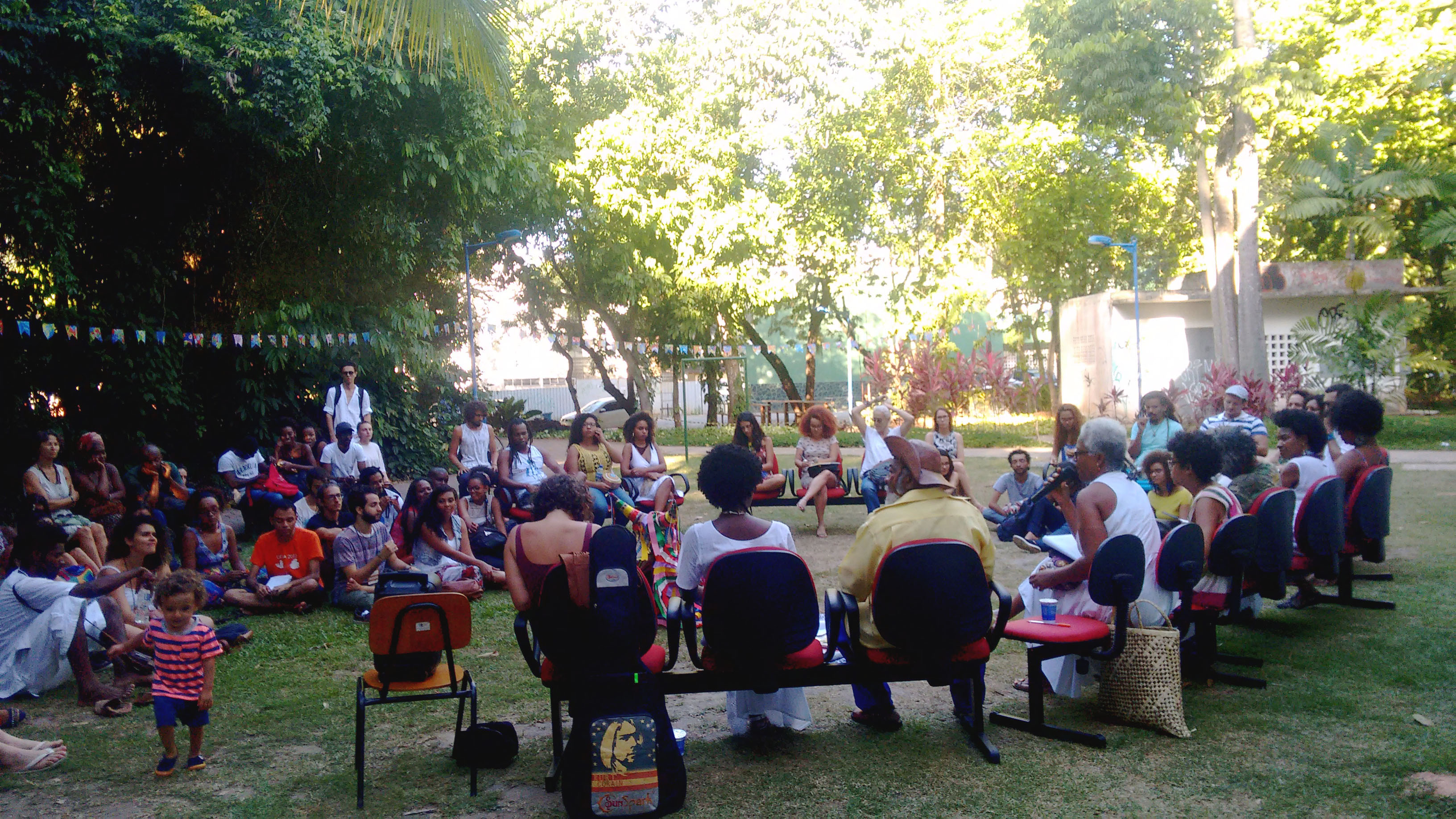 A roda de conversas teve início com o rapper Uh! Neto, que cantou e fez rimas relacionadas ao tema. Em seguida, a convidada Ritinha Santa, do Grupo de Mulheres do Alto das Pombas, falou sobre a luta e a resistência das mulheres negras, dialogando com o tema e a relação do grupo com a Universidade. “Vir aqui nesse momento e socializar um processo histórico, é dizer acima de tudo que a universidade precisa de uma outra epistemologia que não seja a eurocêntrica. Precisa estar aberta a um processo de conhecimento da Cultura Popular”, argumenta.