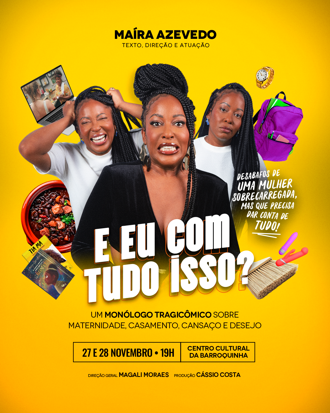 Após uma temporada de sucesso e sessões esgotadas, Maíra Azevedo (conhecida nacionalmente como Tia Má) volta ao palco com o monólogo “E Eu Com Tudo Isso?”. A nova temporada, em curtíssima agenda, ocorre nos dias 27 e 28 de novembro, às 19h, no Espaço Cultural da Barroquinha.