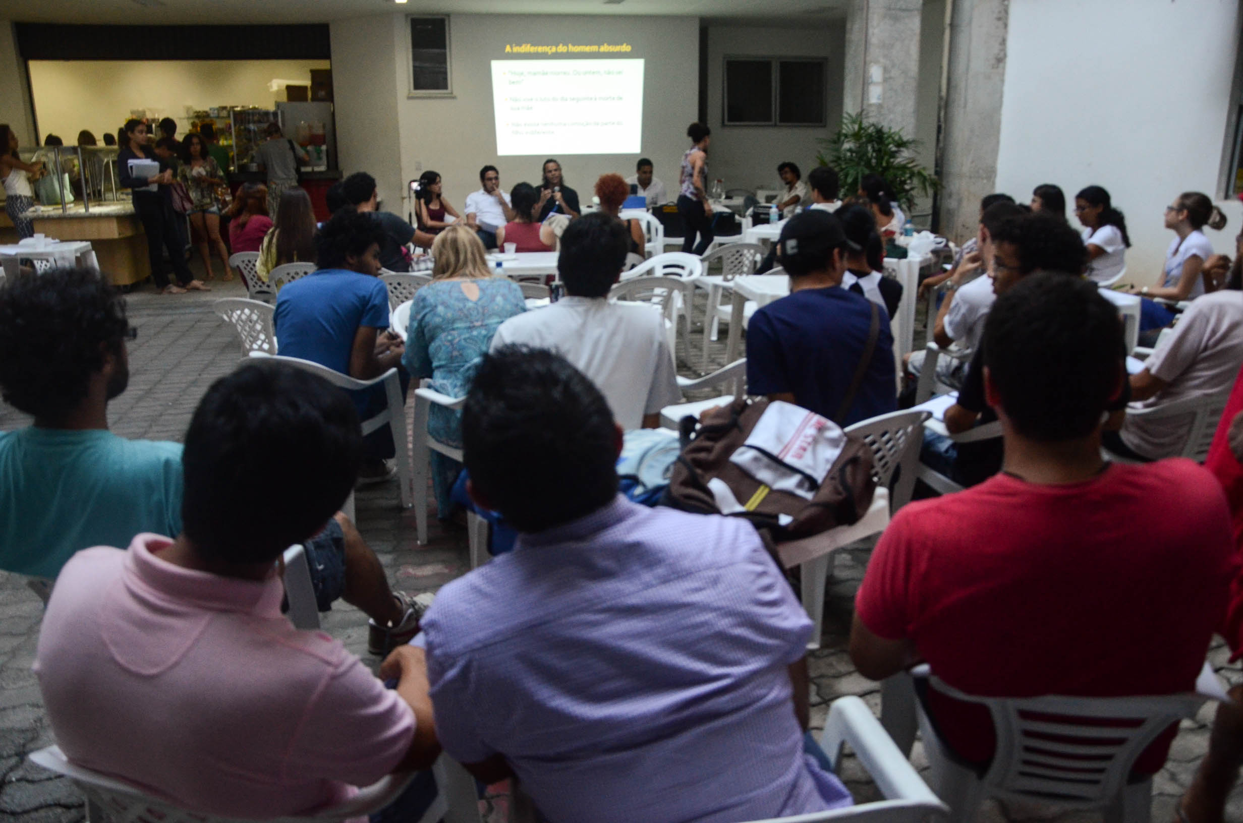 Escrito em 1942, no auge do pós-guerra – fato que influenciará de maneira decisiva o conteúdo da produção de Camus – O Estrangeiro narra as desventuras do anti-herói, Mersault, um personagem comum, julgado pela sociedade por reagir com indiferença à notícia da morte da mãe, condenado à morte por matar gratuitamente um árabe e que subverte o modelo tradicional de herói, negando os traços mais marcantes do que caracterizaria o caráter desse. Clássico da literatura estrangeira, o romance foi o tema de debate da 2ª edição do projeto de extensão “Oficinas Ler e Pensar”, idealizado e produzido pelos estudantes do Pet-Letras e do Pet-Filosofia, ambos programas da UFBA. O evento foi realizado no final da tarde de ontem, no espaço em que funciona a cantina do Departamento de Letras.