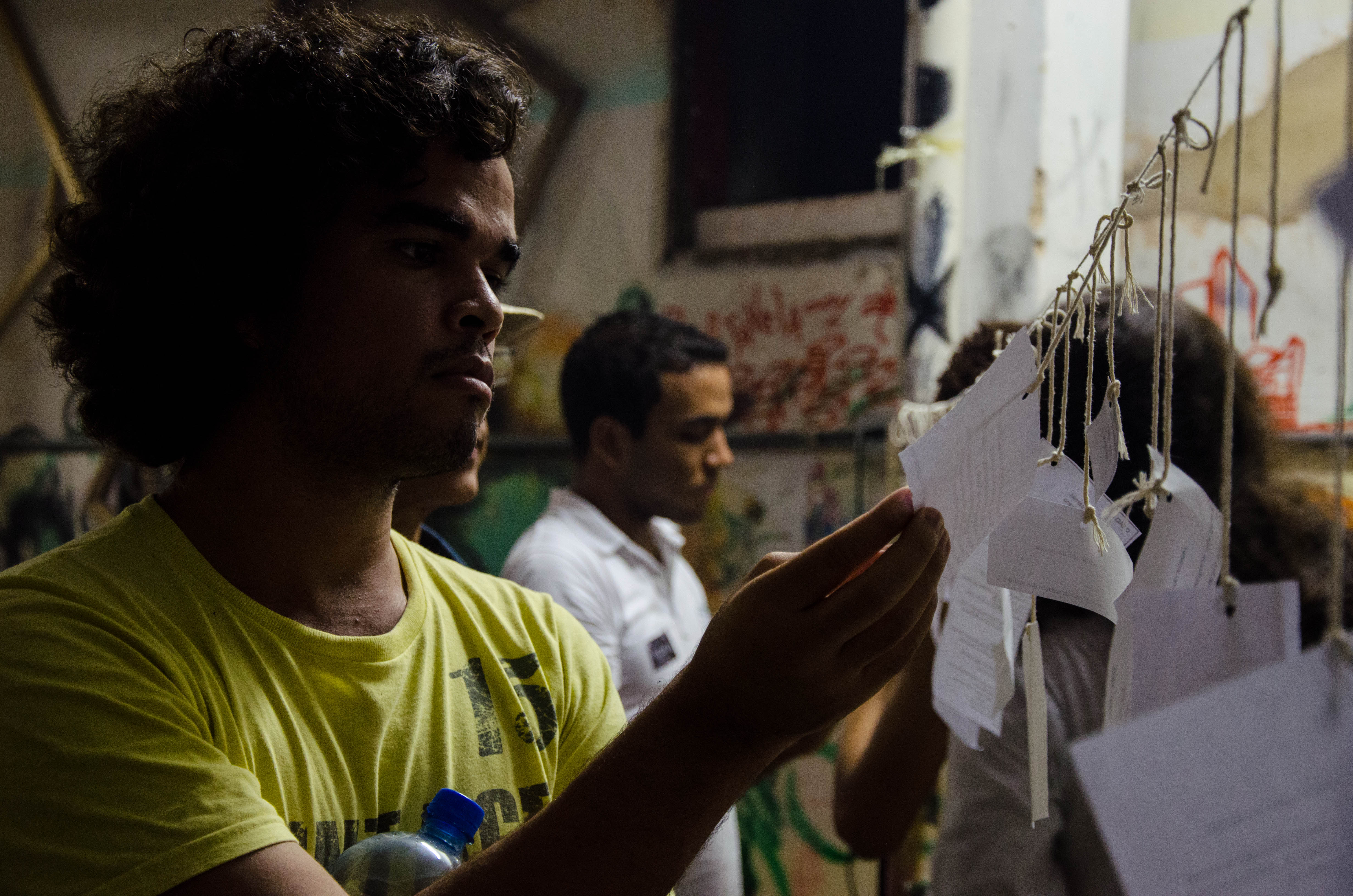 Que queimem os poemas! – “Nossa proposta aqui hoje é construir de fato uma fogueira e queimar os poemas a fim de que a gente possa sentir a poesia além dela, em si. Além da sensação do ler, do sentir, vamos também inalar a poesia”, explicou Angélica Behrmann. Em cortejo, então, os presentes seguiram a caminho do Atelier que, naquela noite, seria testemunha de mais um capítulo de seres humanos experienciando coletivamente um porvir. Um a um pôde colher no varal o seu poema, declamá-lo e inalá-lo, na intenção de preservar aquele espaço, seu significado e memória. A noite também foi palco de performances teatrais.
