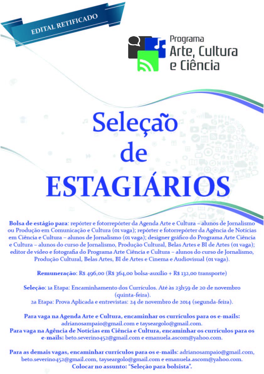 Informamos que o edital aberto para a seleção de novos estagiários do Programa, Arte, Cultura e Ciência, foi retificado. As datas das fases de seleção foram prorrogadas. Também haverá seleção de um estagiário, para a Agência de Notícias Ciência e Cultura.