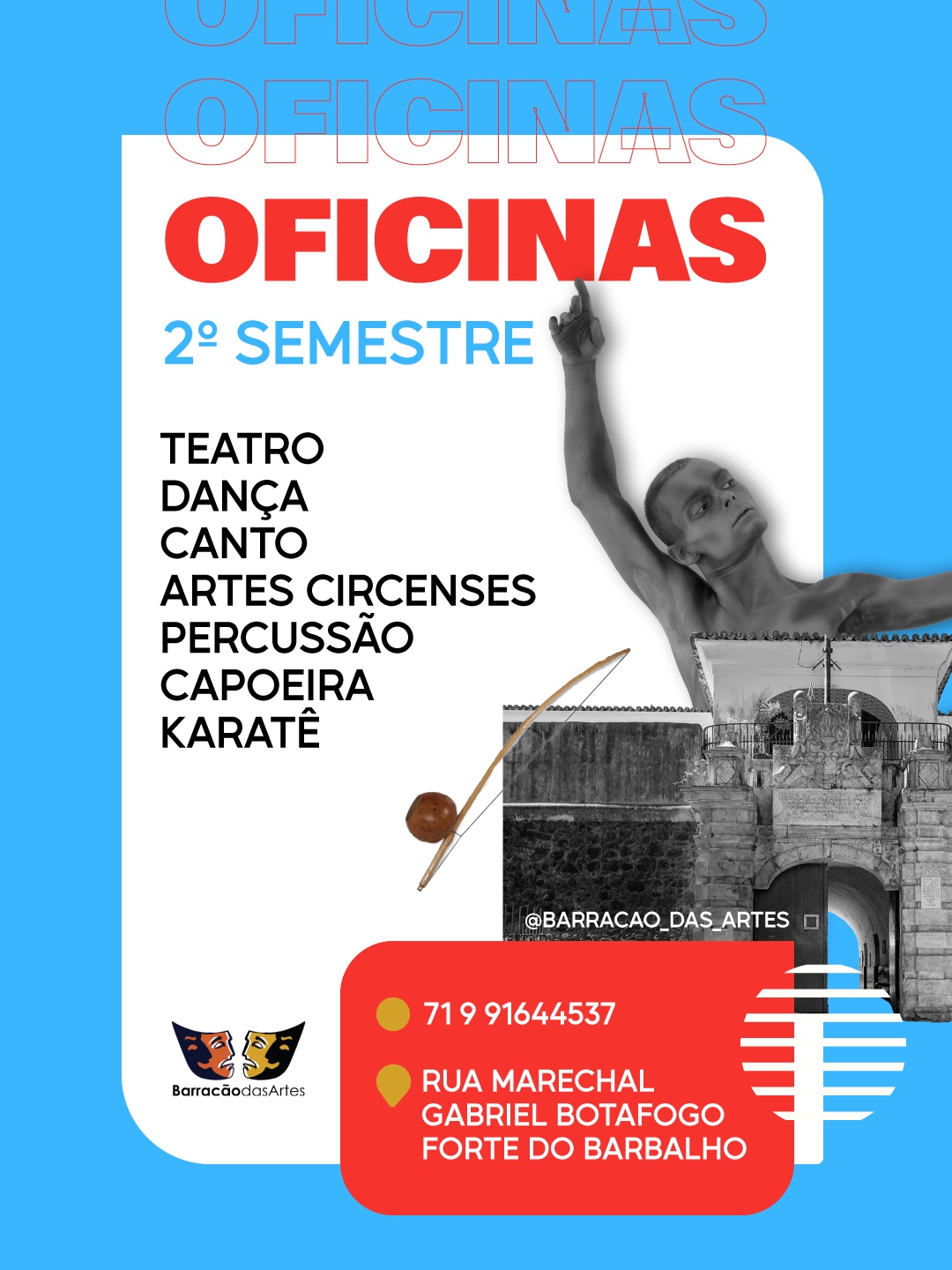 As Oficinas acontecerão no período de 04 de agosto a 19 de dezembro, no Barracão das Artes (Rua Marechal Gabriel Botafogo, S/N, Barbalho) – Forte do Barbalho.