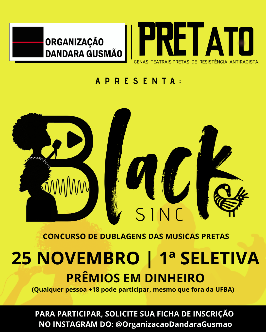 A Escola de Teatro da Universidade Federal da Bahia (UFBA) recebe, entre os dias 15 e 24 de novembro de 2025, as inscrições para o BLACK SINC – Concurso de Dublagens das Músicas Pretas. A iniciativa, gratuita e inédita, é realizada pela Organização Dandara Gusmão, um programa de extensão da instituição dedicado à promoção de práticas antirracistas por meio da arte.