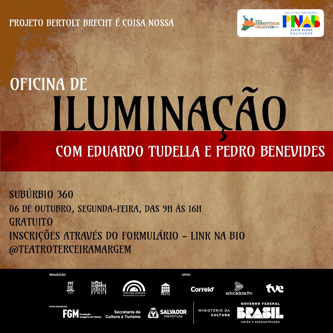 Numa parceria entre a Cia. de Teatro da UFBA e o grupo de teatro Terceira Margem, o projeto “Brecht é Coisa Nossa” promove, gratuitamente, a oficina de iluminação “PRÁXIS TEATRAL E SUAS RAÍZES VISUAIS: Estratégias de composição da iluminação do espetáculo HOMEM É HOMEM de Bertolt Brecht”. Descentralizando o acesso à formação profissional em artes cênicas, a atividade acontece no Espaço Cultural Boca de Brasa Subúrbio 360 e será orientada por dois dos nomes mais experientes e especializados nessa área: Eduardo Tudella e Pedro Benevides, ambos professores da Escola de Teatro da Ufba.