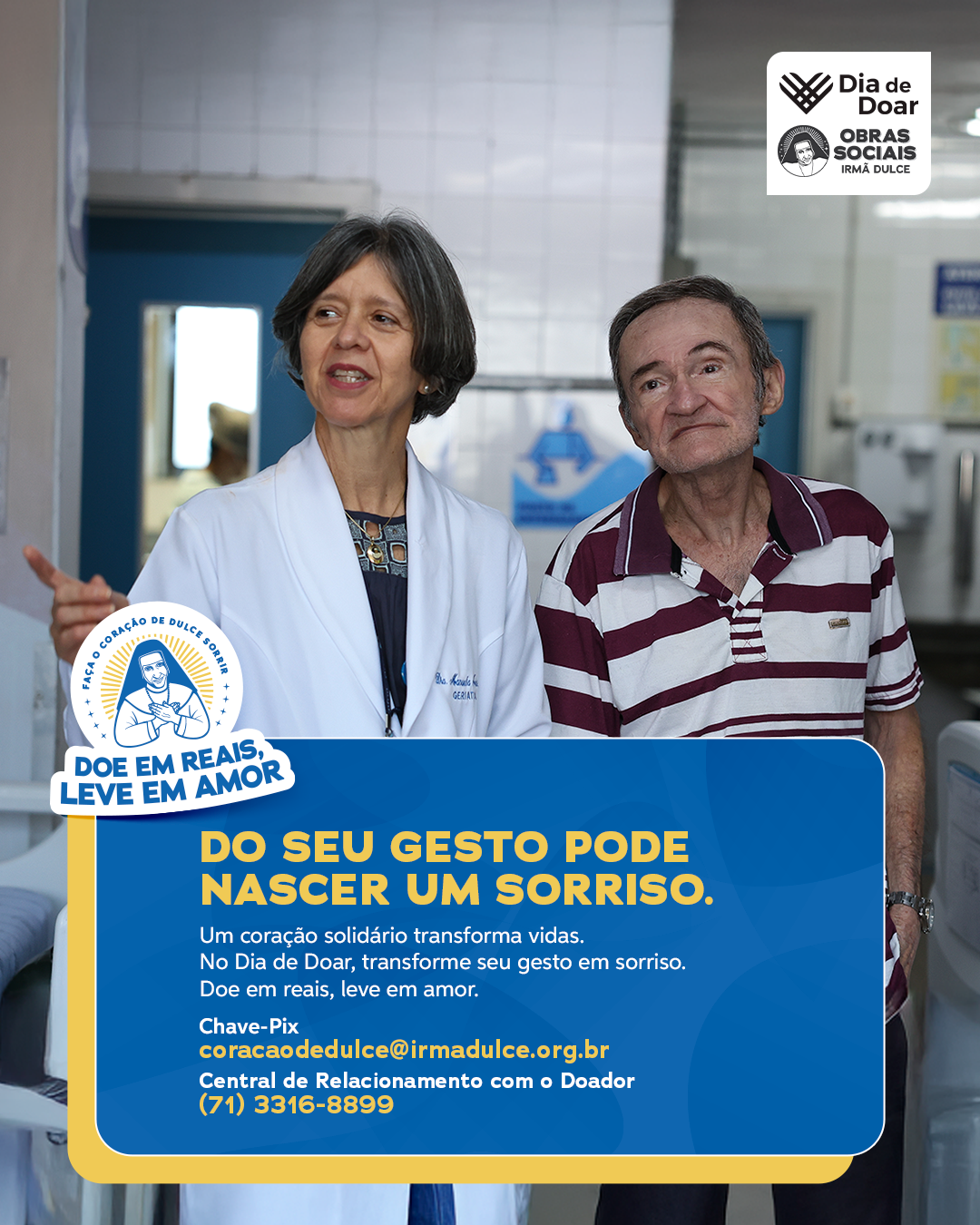 Como ajudar: As doações podem ser feitas por meio da chave PIX coracaodedulce@irmadulce.org.br; pelo site doe.irmadulce.org.br ou através da Central de Relacionamento com o Doador pelo número (71) 3316-8899, que também funciona como WhatsApp.
