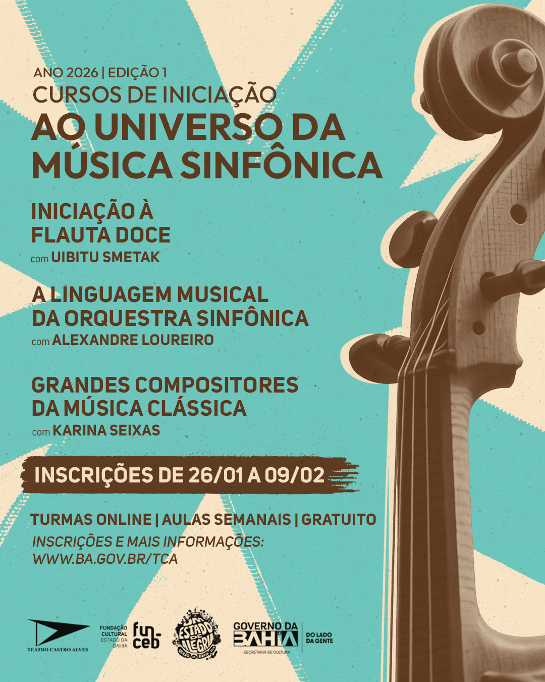 O Teatro Castro Alves (TCA) abre, entre os dias 26 de janeiro e 9 de fevereiro, as inscrições para a 1ª edição de 2026 dos Cursos de Iniciação ao Universo da Música Sinfônica. Gratuitos e realizados de forma online, os cursos são voltados para pessoas a partir de 15 anos interessadas em ampliar a escuta musical e compreender melhor a música de concerto.